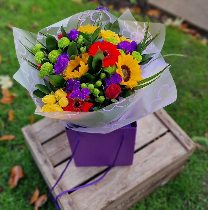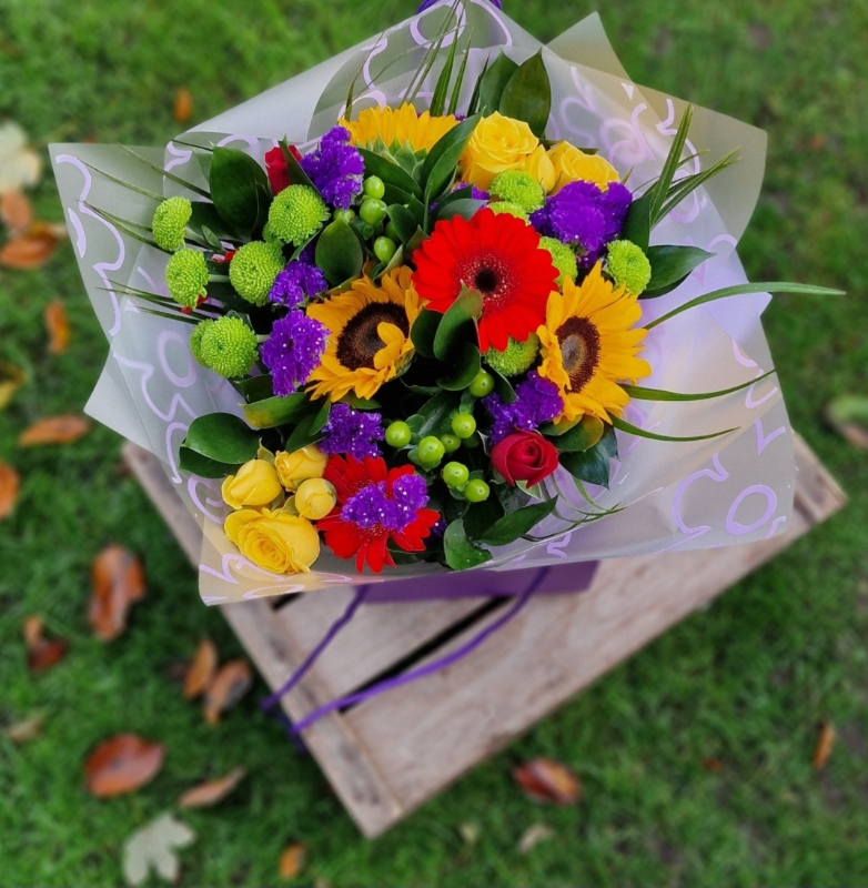 This stunning hand tied with Sunflowers, Gebera, Hypericum, Roses and mixed foliage.