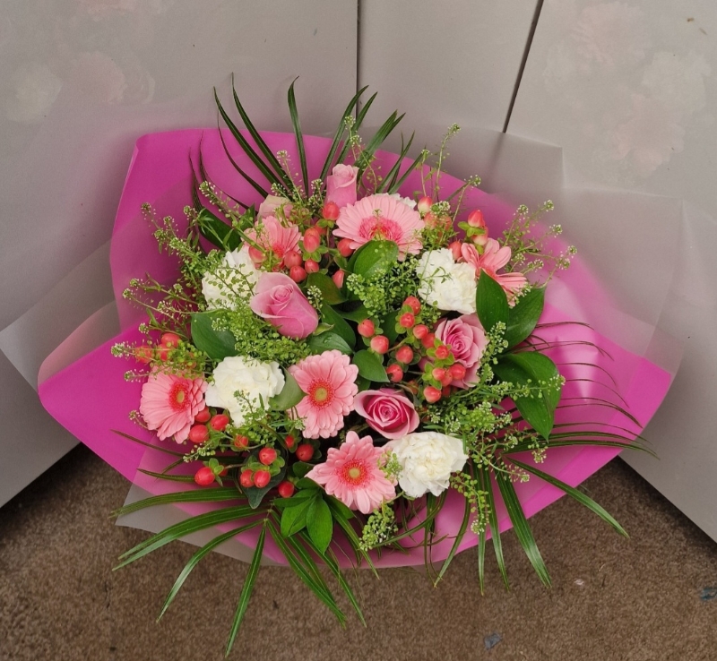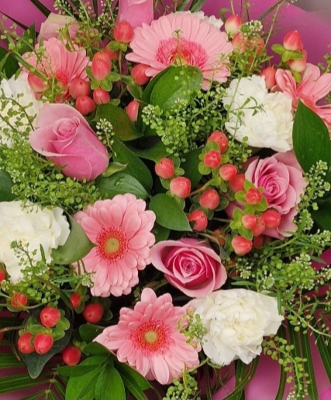 This beautiful hand tied with Gebera, Roses, Carnation and mixed foliage.