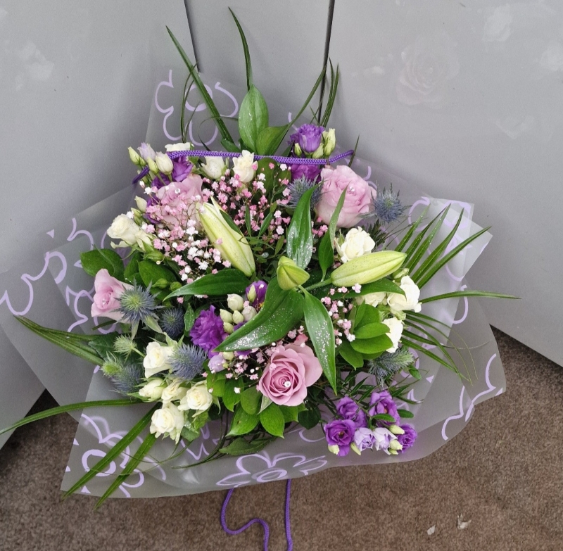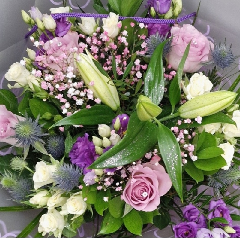 Beautiful hand tied of fresh flowers Lilies, Lisianthus, Thistle, Carnation and mixed foliage.