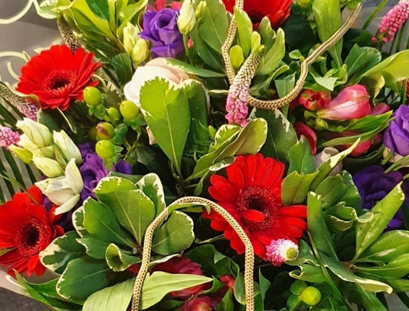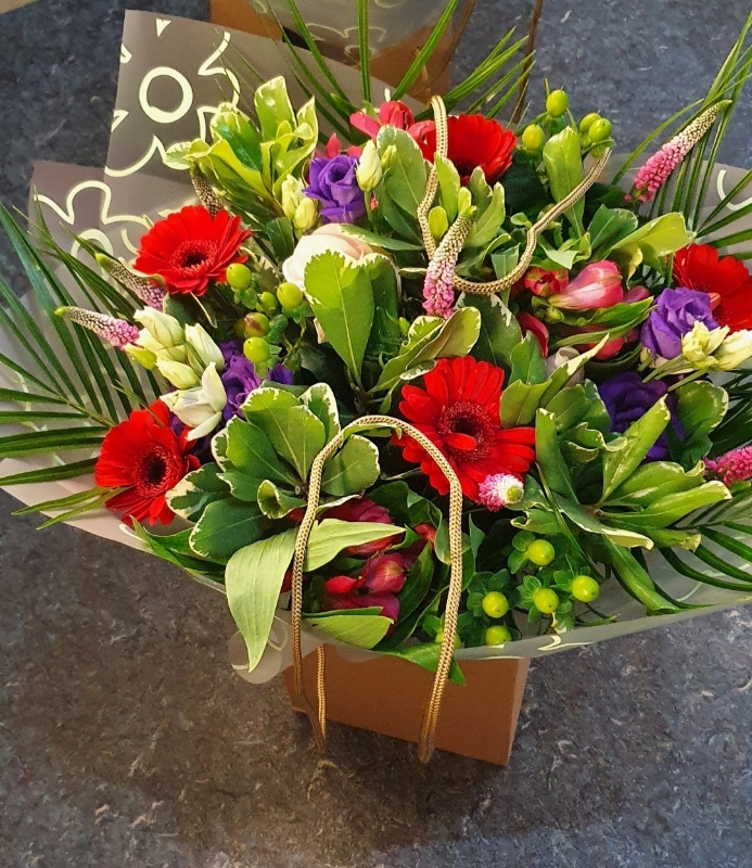 A beautiful hand tied of Gebera, Lisianthus, Hypericum, Alstro, Veronica and mixed foliage.
