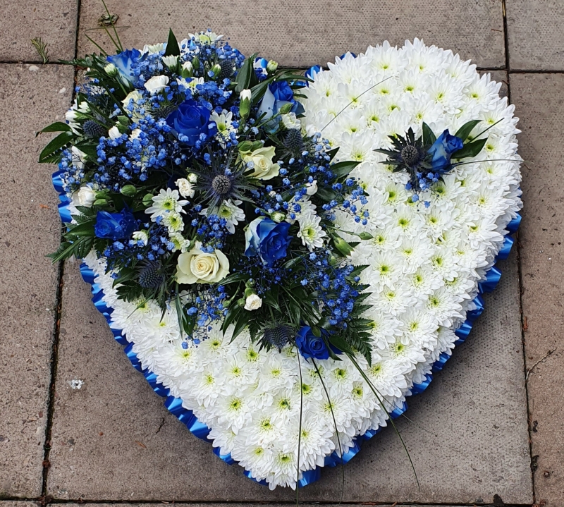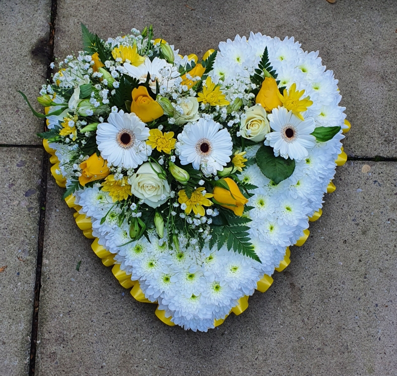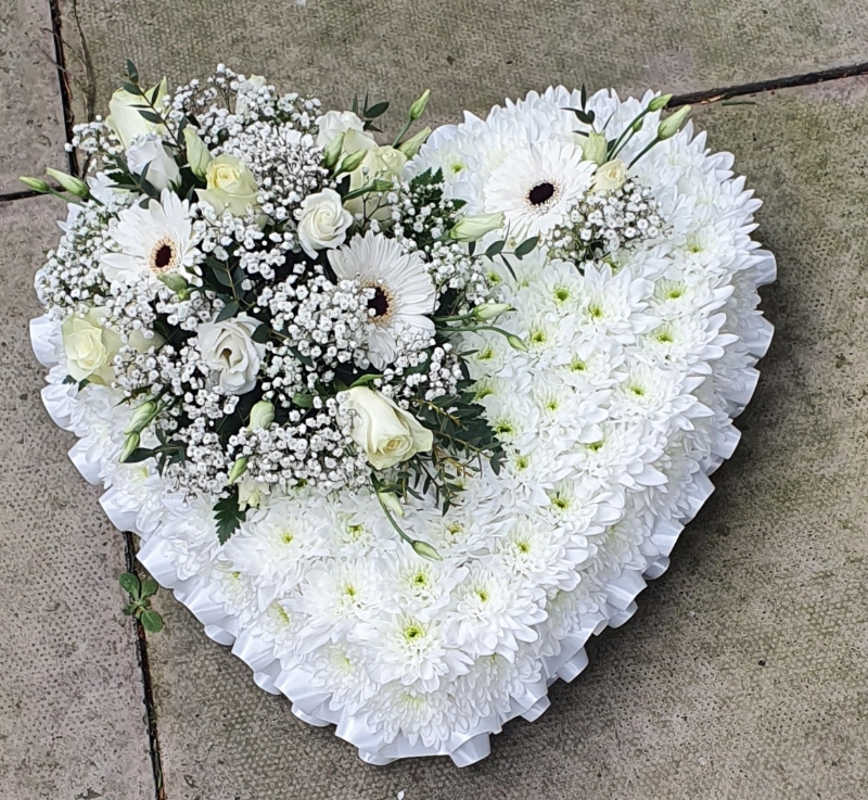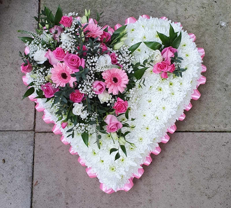 Based Heart with Ribbon edge,Based in Double White Chrysanthemum with spray of mixed flowers in colours you would like .