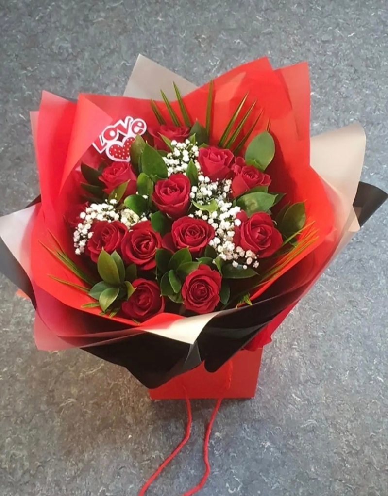 Classic romantic gesture to a loved one of the best roses with mixed foliage and gypsophila