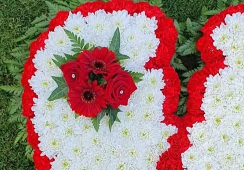 This beautiful broken Heart is  23inch with Red Carnation edge based White with Red Roses, Red Gerbera in spray