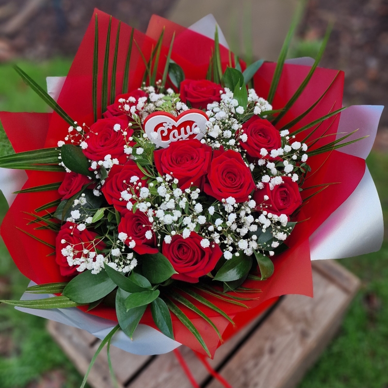 Stunning velverty red rose's with mixture of foliage and gypsophila. Beautiful for a valentine day gift.