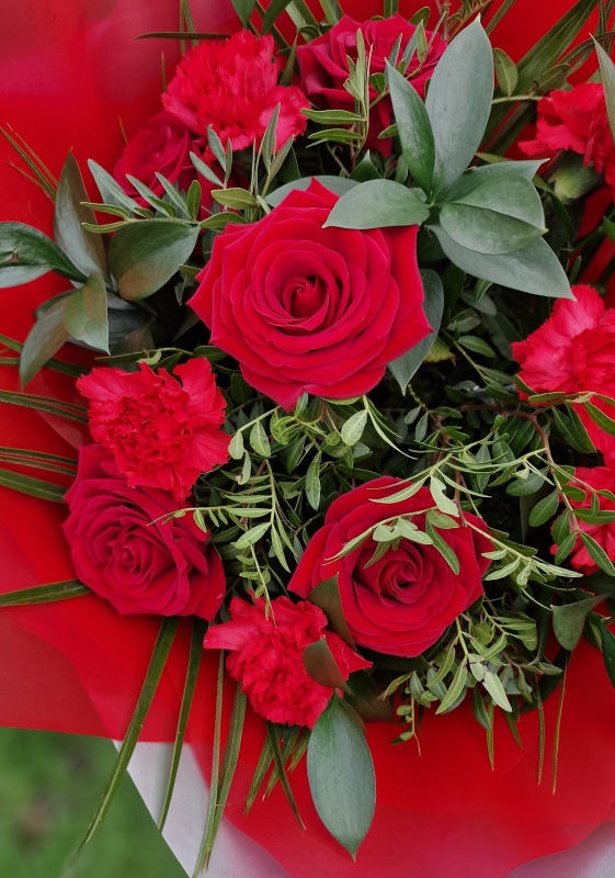 Beautiful hand tied of red roses and carnation with mixture of foliage. Beautiful valentine gift.